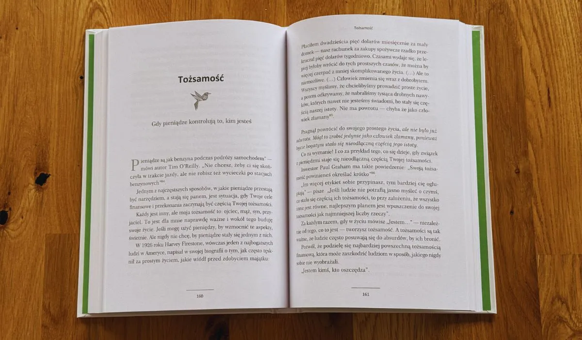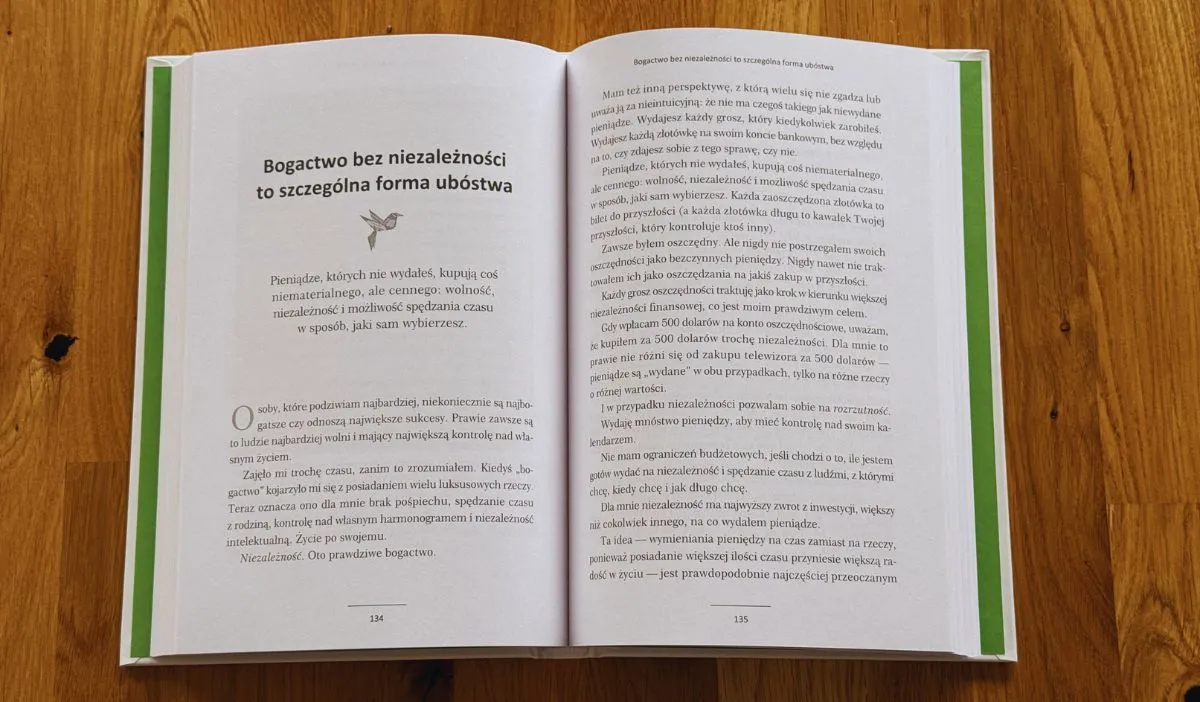 Jeden z rozdziałów zawiera myśl, która długo pozostaje w głowie. „Bogactwo bez niezależności to szczególna forma ubóstwa”. Housel opisuje, jak jego rozumienie pojęcia bogactwa zmieniło się z biegiem lat. Kiedyś kojarzyło mu się z posiadaniem wielu luksusowych rzeczy. Teraz oznacza brak pośpiechu, kontrolę nad własnym harmonogramem i wolność intelektualną.
